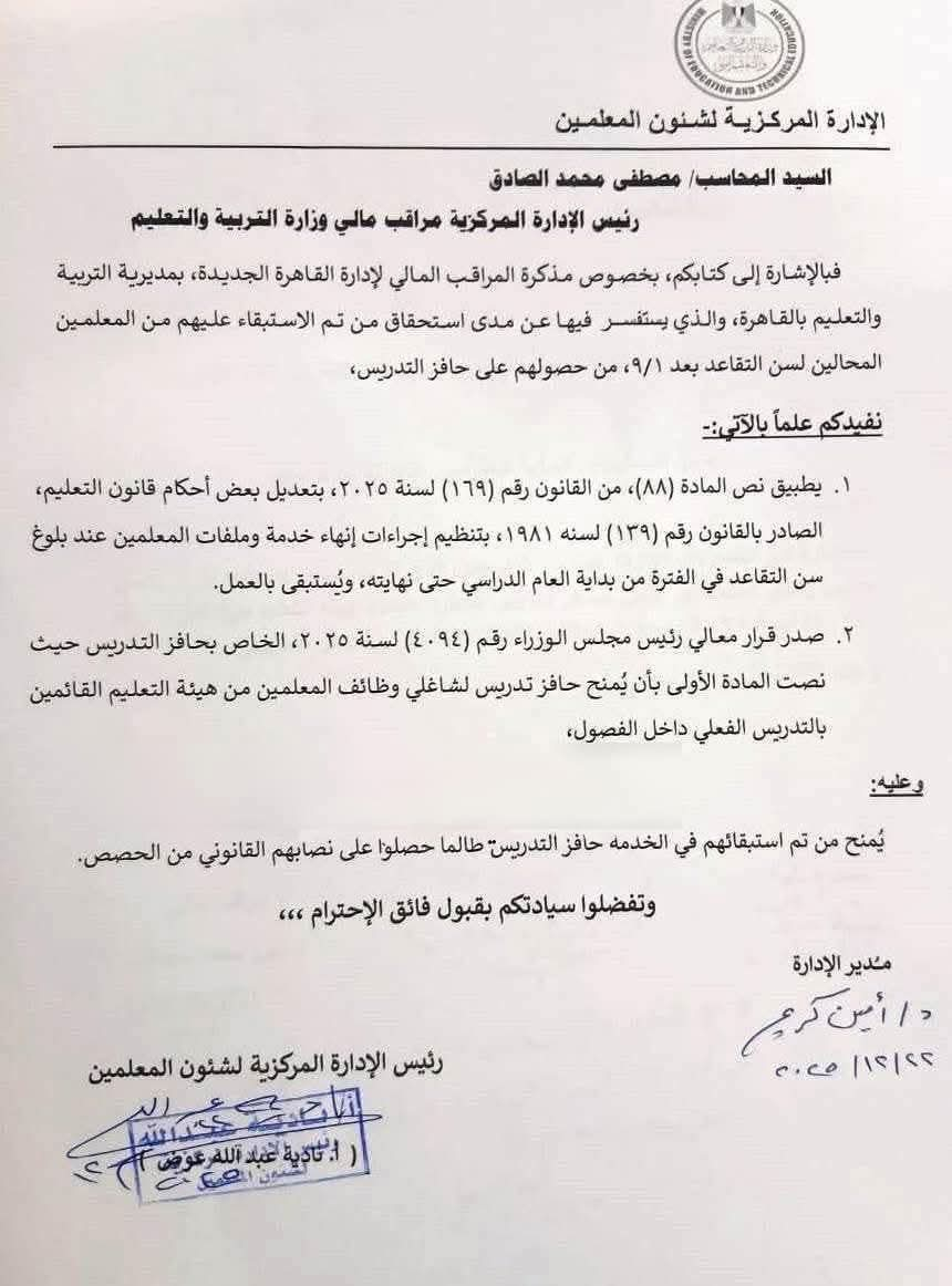 منح حافز التدريس لمن تم استبقائهم في الخدمــــة طالمــــا استوفوا نصابهــم القانوني من الحصصمنح حافز التدريس لمن تم استبقائهم في الخدمــــة طالمــــا استوفوا نصابهــم القانوني من الحصص0 Comments 0 Shares 16 Views 0 ReviewsPlease log in to like, share and comment!