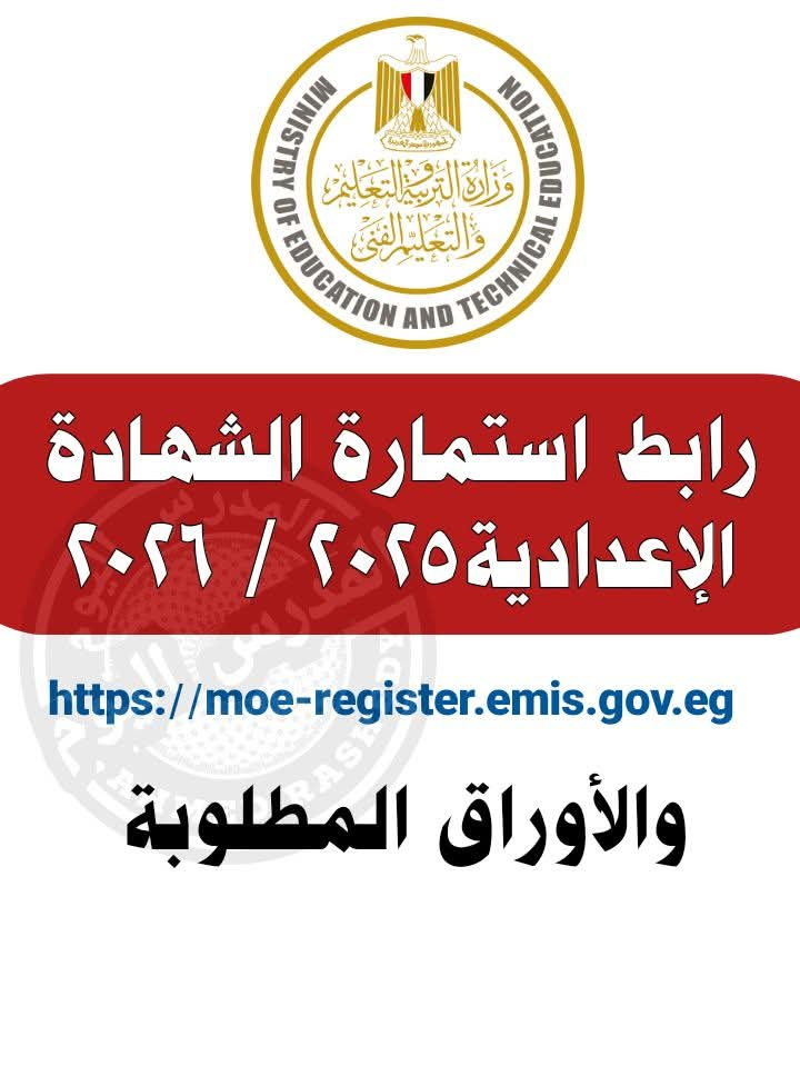 ويمكن الآن لجميع طلاب الصف الثالث الإعدادي الدخول على رابط استمارة الشهادة الإعدادية2025 / 2026 على موقع وزارة التربية والتعليم والتعليم الفني من خلال الضغط على https://moe-register.emis.gov.eg/