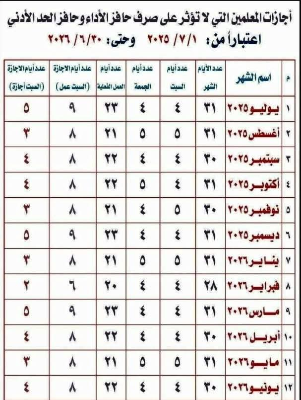 بالنسبة للمعلمين استيفاء النصاب الاسبوعي للحصص المقررة على مدار الشهر مع مراعاة عطلات الأعياد والمناسبات الرسمية وكذا حقة في الاجازات العارضة والاعتادية المقررة قانونا