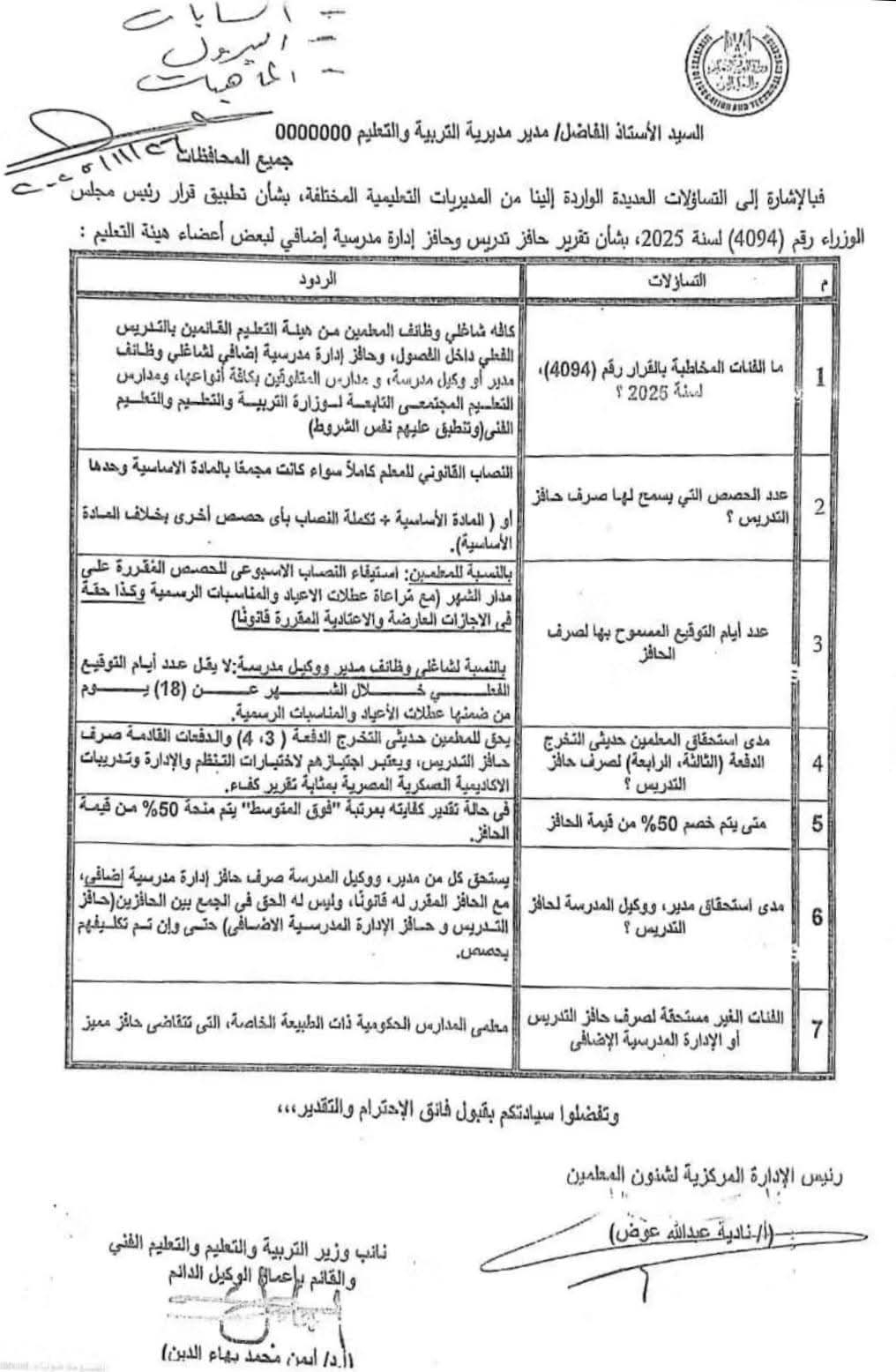 الوزراء رقم (٤٠٩٤) لسنة ٢٠٢٥، بشأن تقرير حافز تدريس وحافز إدارة مدرسية إضافي لبعض أعضاء هيئة التعليم :
